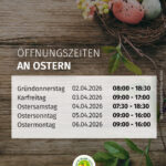 Liebe Kunden, anlässlich der bevorstehenden Osterzeit wünschen wir Ihnen frohe und erholsame Ostern! Nutzen Sie die Gelegenheit, um die ersten Sonnenstrahlen des Frühlings zu genießen und natürlich, um sich mit unseren frischen, saisonalen Produkten zu verwöhnen. Bitte beachten Sie unsere geänderten Öffnungszeiten über Ostern: Gründonnerstag: 8:00 bis 18:30 Uhr Karfreitag: 10:00 bis 17:00 Uhr Ostersamstag:…